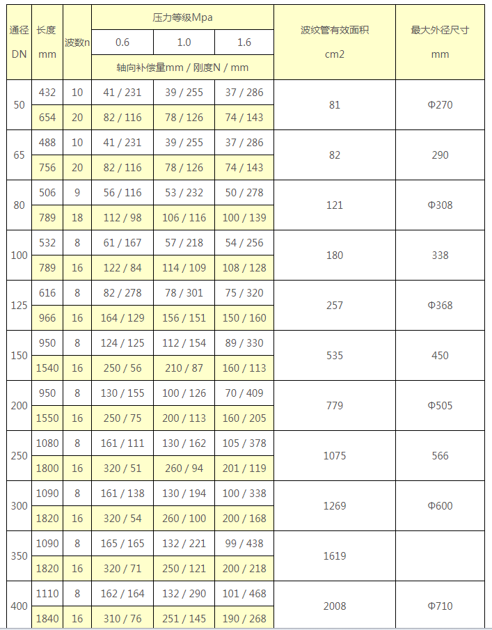 舉例:0.6TWY500×8JB表示:公稱通徑為500mm,工作壓力為0.6MPa(6kg/cm2)波數為8個,不銹鋼管連接的軸向型外壓式波紋補償器。